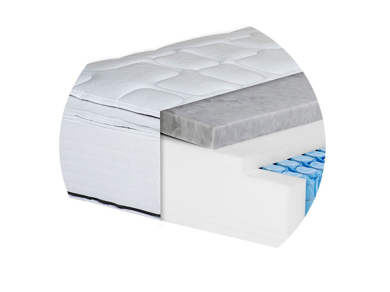 - Kernaufbau: ca. 12 cm hoher 7-Zonen Taschenfederkern mit ca. 480 Federn (Federkernmaß: 100 x 200 cm) , beidseitige ca. 3 cm starke Abdeckung aus Komfortschaum und zusätzliche ca. 5 cm hohe Topper-Einlage aus 5 cm Hydruxschaum