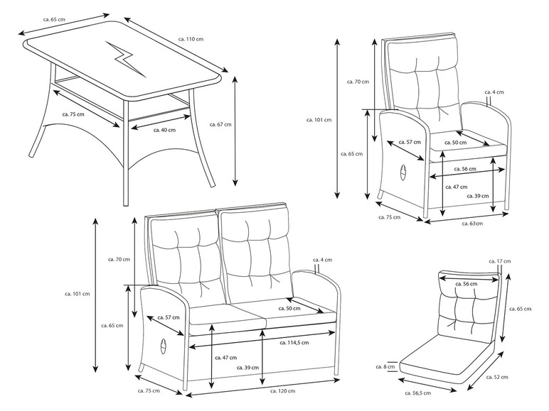 - Sessel: je ca. L 75 x B 63 x H 101 cm