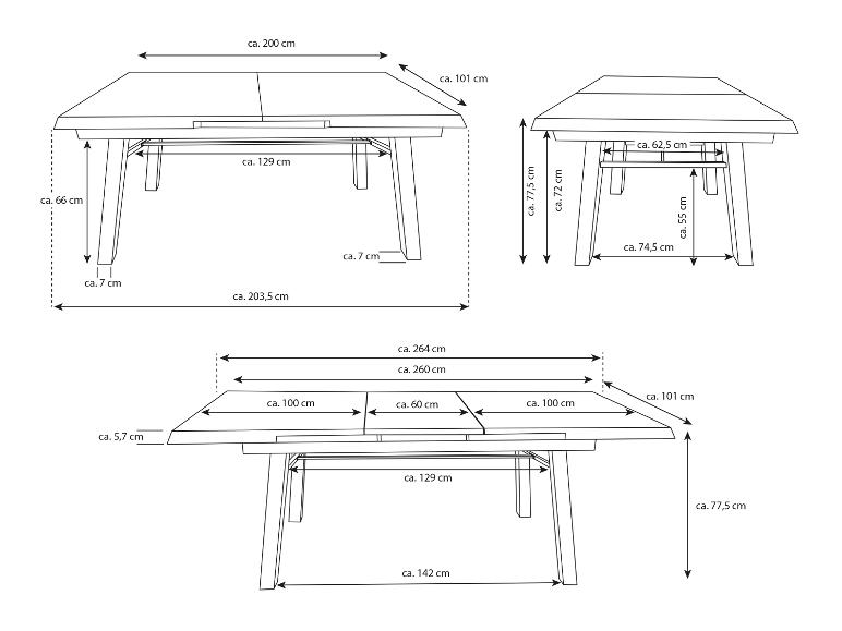 Maße: | Tisch: ca. L 200/260 x B 100 x H 76 cm, Sessel: ca. T 63 x B 58 x H 109 cm |