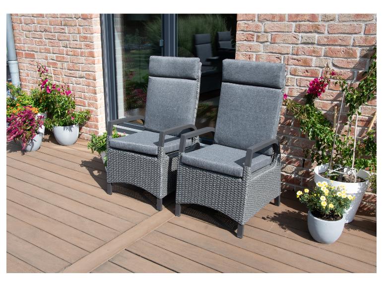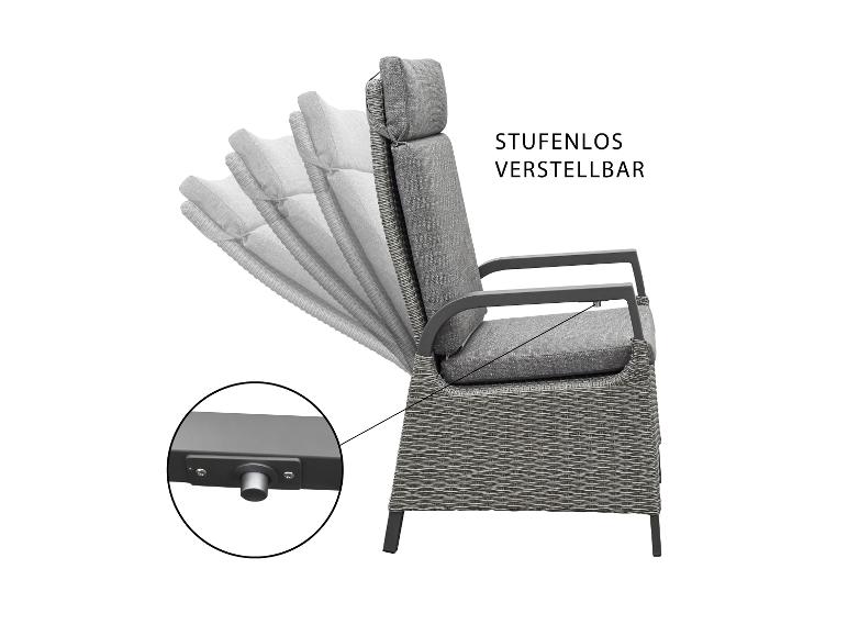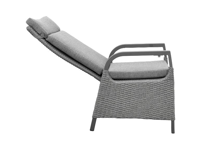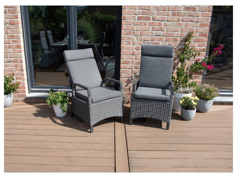 Material: | Gestell: Aluminium, Geflecht: Polyrattan, Auflagenbezug: 100 % Polypropylene, Füllung Sitzkissen: 90 % Polyurethane + 10 % Polyester, Füllung Rückenkissen: 100 % Polyester |