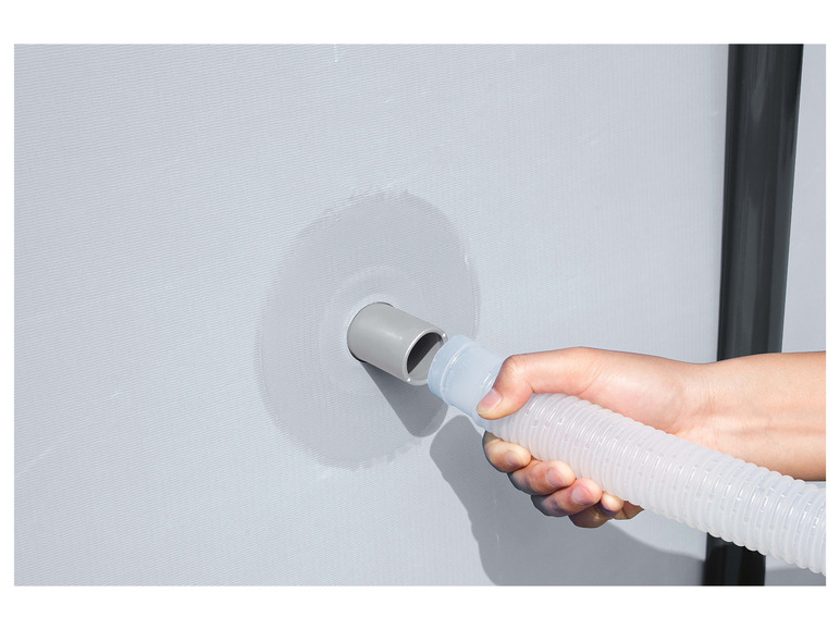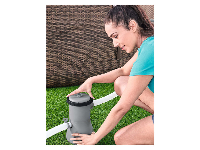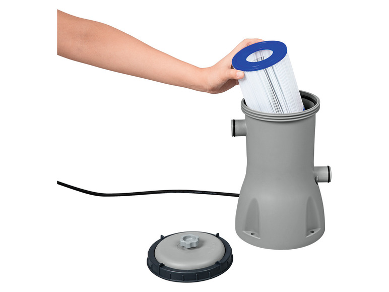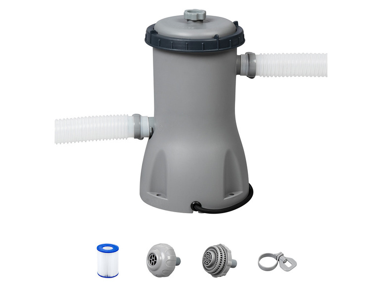 Lieferumfang | Pumpe, Filterkartusche #58094 Gr. II (10,6 x 13,6 cm), 2x Schläuche à 1,5 m / Durchmesser 32 mm, 4x Schlauchklemmen, 1x Pooleinlass-Sieb, 1x Poolauslass-Sieb für Ø 32mm |