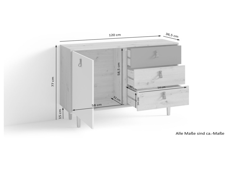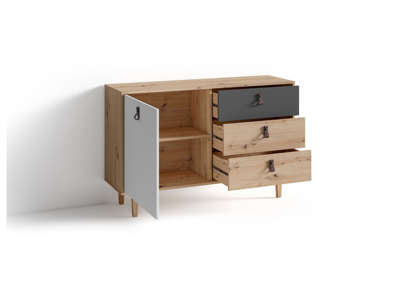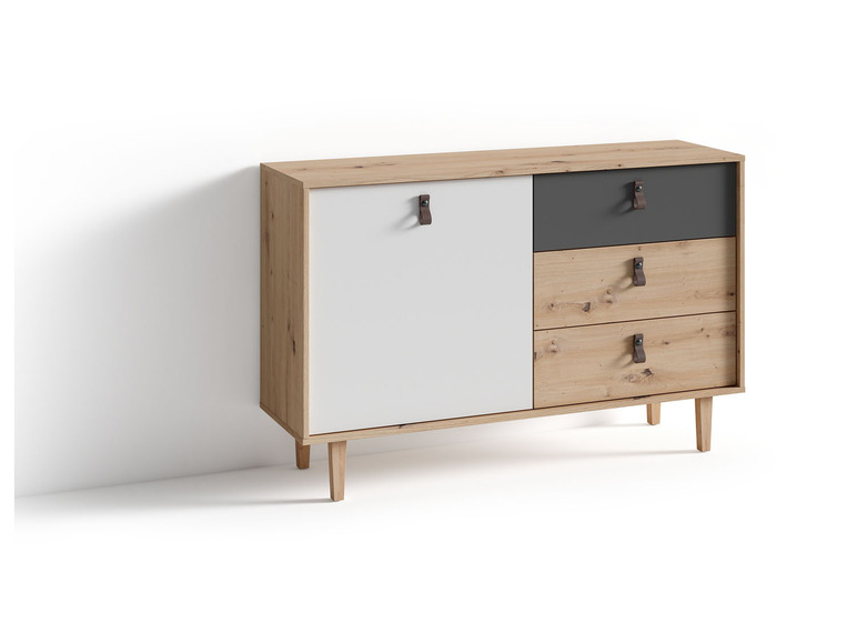 Das Sideboard BILL ist ein echter Hingucker in Ihrem Wohnzimmer und bietet reichlich Stauraum. Die Kommode verfügt über eine Tür mit zwei großen Fächern dahinter und drei geräumige Schubladen. Der Korpus des Möbels ist mit einer hochwertigen Melaminbeschichtung in Artisan Eichen-Optik überzogen, welche äußerst langlebig und pflegeleicht ist. Die weiße Tür und die braunen und anthrazit farbenen Schubladenfronten geben dem Möbel ein besonderes Aussehen und unterstreichen den skandinavischen Stil. Die Griffe sind aus Kunstleder-Laschen in dunkelbraun gefertigt. Die Kommode verfügt über vier massive Eichen-Holz-Füße, welche nicht nur edel aussehen, sondern auch eine besondere Stabilität bringen.