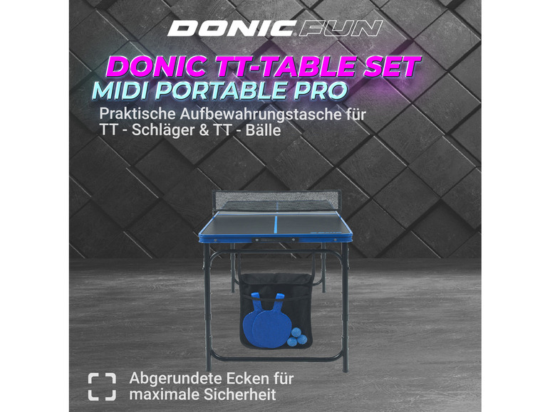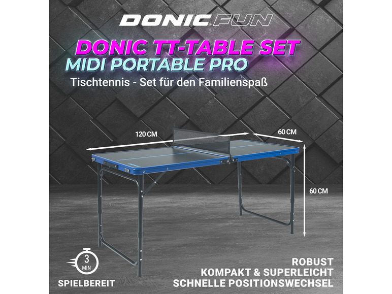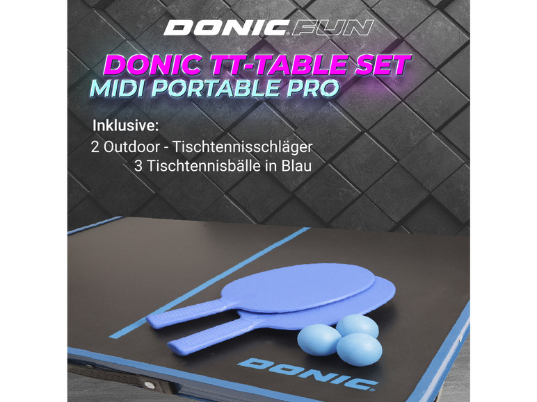 Lieferumfang: | 1 x Tischtennisplatte, 1x Tischtennisnetz, 2x Tischtennisschläger, 3 x Tischtennisbälle, 1 x Tragetasche |