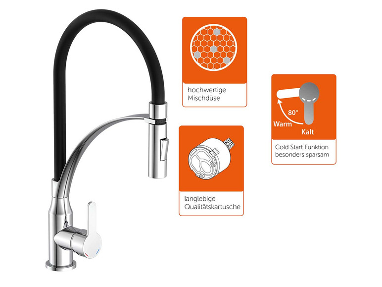 - Mischbatterie Küche mit geräuschgeprüfter, auswechselbarer Qualitäts-Kartusche mit langlebigen, keramischen Dichtungen zur präzisen Regelung der Durchflussmenge und der Wassertemperatur
