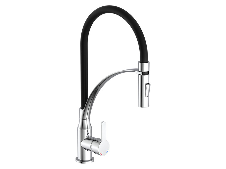 - Elegante Standarmatur in Chrom mit hohem Bogenauslauf und farbigem Soft-Touch-Auslauf - Blickfang für die Küche