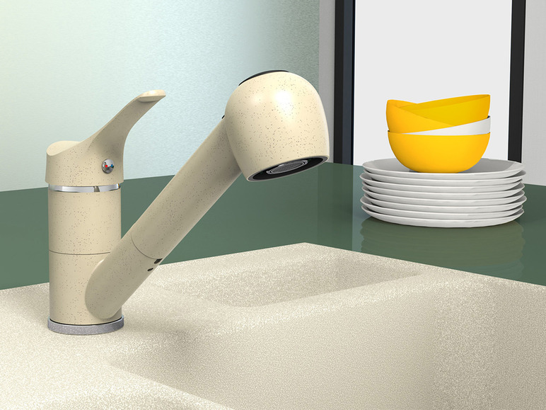 - Dank der herausziehbaren und 2-fach verstellbaren Geschirrbrause bietet der Wasserhahn flexible Einsatzmöglichkeiten in der Küche. Zum Beispiel zum Waschen von Obst und Gemüse oder aber für die Vorreinigung, bevor das Geschirr in den Geschirrspüler einsortiert wird.
