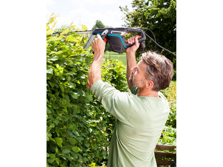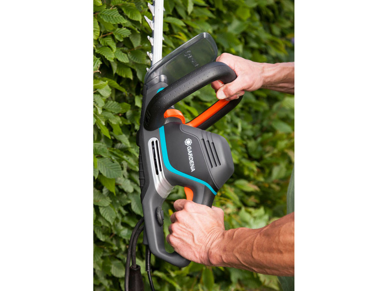 Die leistungsstarke Elektro-Heckenschere PowerCut 700/65 von GARDENA ist ideal für den komfortablen Rückschnitt großer Hecken mit starken Ästen geeignet. Dank des ergonomisch geformten ErgoLine-Griffes liegt die PowerCut komfortabel in der Hand. Die Heckenschere zeichnet sich durch eine ausgewogene Balance aus und wird selbst bei längeren Einsätzen optimal in jeder Schneidposition geführt. Die Auslösetaste kann in jeder Position leicht bedient werden. Ausgestattet ist die kraftvolle elektrische Heckenschere mit lasergeschnittenen Präzisionsmessern. Sie ermöglichen ein sauberes und effizientes Schneiden mit geringem Kraftaufwand. Beim mühelosen Schneiden von starken Ästen hilft die ProZone mit Profischliff und Spezialzähnen. Die PowerCut 700/65 verfügt am Messerende über einen Anschlagschutz. Er sorgt dafür, dass die Messer beim Schneiden in Bodennähe oder entlang von Hauswänden und Gartenmauern geschützt sind. Zur Sicherheit während des Schneidens trägt die Kabelzugentlastung bei, die ein unbeabsichtigtes Lösen des Kabels verhindert.