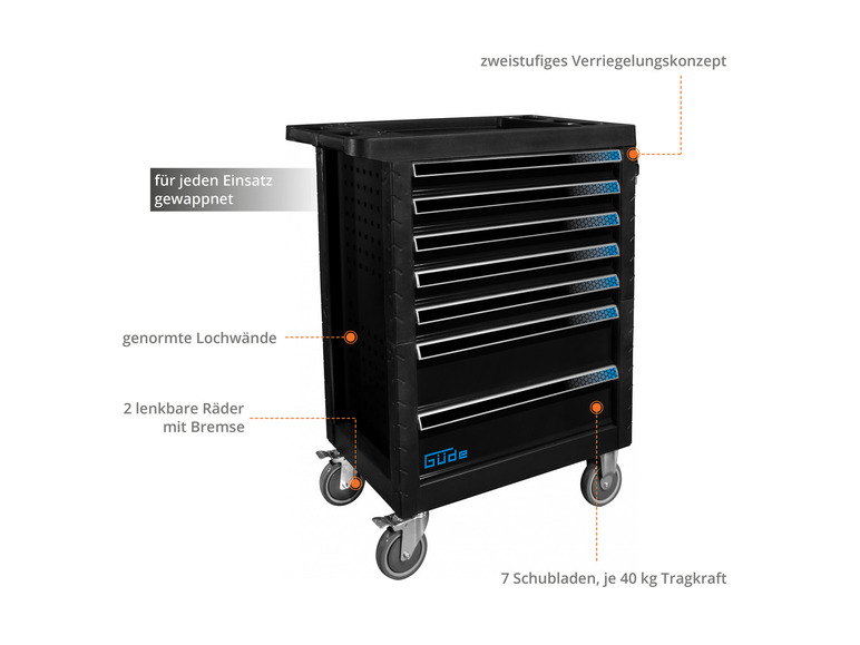 Der Werkstattwagen WG Black Line II kommt mit einem 165-teiligem Werkzeugset zu dir, welches sicher in Schubladen mit kugelgelagertem Vollauszug verstaut ist. In Punkto Sicherheit und Standkraft überzeugt er durch eine Auszugsicherung der Schubladen, den Kantenschutz, die Zentralverriegelung mit 2 Schlüsseln und den Feststellbremsen an den beiden Lenkrollen – so bleibt alles dort wo es hingehört, auch wenn der Wagen bewegt wird.