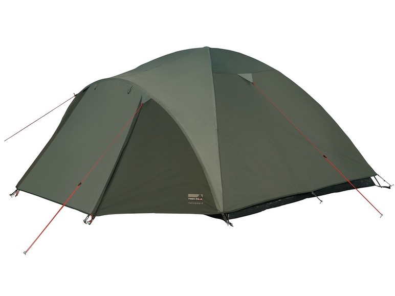 High Peak Zelt Nevada 4. Doppeldach Kuppelzelt in attraktivem Design. Der Vorbau bietet einen wettergeschützten Zugang zum Innenzelt und bietet Stauraum für die Campingausrüstung. Der Eingang zum Schlafbereich ist mit einem Moskitonetzfenster ausgerüstet und hält lästige Plagegeister fern. Die Nähte sind mittels Nahtband wasserdicht versiegelt und gewähren eine bessere Naht-Reißfestigkeit. Praktische Taschen im Innenzelt für zum Beispiel Hygieneutensilien und eine Lampenhalterung für eine Campingleuchte oder Taschenlampe runden den Komfort ab.Das Nevada 4 bietet 4 Personen Unterkunft oder reichlich Platz für 3 Personen mit Gepäck. Ob zum Camping, zur Übernachtung bei Freunden oder zum Festival, das Nevada 4 ist immer der richtige Begleiter. Super Preis – Leistungsniveau. Material- und Artikeldetails Außenzelt: 100% Polyester, PU beschichtet, Nahtband versiegelt. Wassersäule: 2.000 mm. Innenzelt: 100% Polyester, atmungsaktiv. Boden: 100% PE. Gestänge: Fiberglas