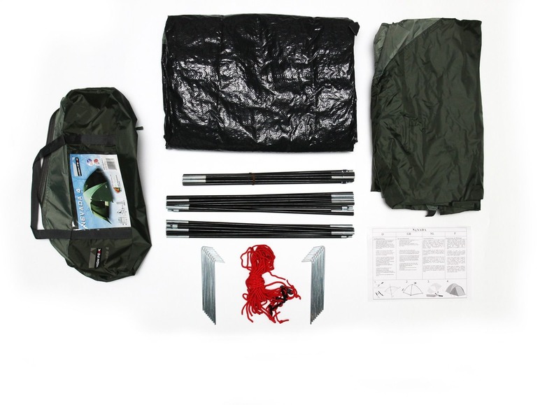 Das Nevada 4 bietet 4 Personen Unterkunft oder reichlich Platz für 3 Personen mit Gepäck. Ob zum Camping, zur Übernachtung bei Freunden oder zum Festival, das Nevada 4 ist immer der richtige Begleiter. Super Preis – Leistungsniveau. Material- und Artikeldetails Außenzelt: 100% Polyester, PU beschichtet, Nahtband versiegelt. Wassersäule: 2.000 mm. Innenzelt: 100% Polyester, atmungsaktiv. Boden: 100% PE. Gestänge: Fiberglas