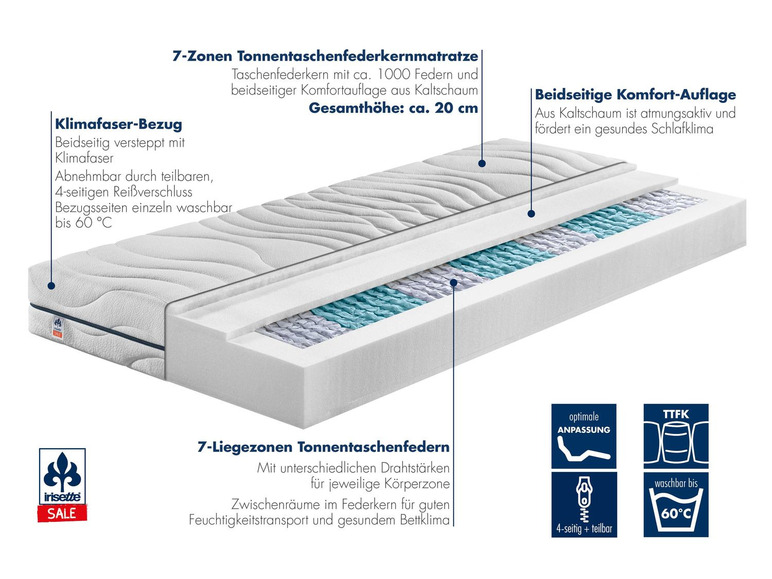Die 1.000er 7-Zonen-Tonnentaschenfederkern-Matratze irisette® »Sylt« ist insgesamt ca. 20 cm hoch. Durch die spezielle tonnenförmige Federform wird eine optimale Körperanpassung und Unterstützung begünstigt. Die beidseitige Komfortauflage aus Kaltschaum ist atmungsaktiv und sorgt für ein gesundes Schlafklima. Der Matratzenbezug ist mit Klimafaser versteppt und besteht aus einem weichen, anschmiegsamen und hautsympathischem Bezugsmaterial.