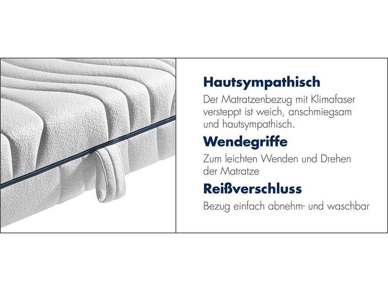 Der Matratzenbezug ist zusätzlich mit einem 4-seitigen Reißverschluss versehen. Das Abnehmen des Bezuges ist deshalb sehr einfach. Die Ober- und Unterseiten des Bezuges sind trennbar, so dass es möglich ist, auch nur eine Seite des Bezuges (einzeln) zu waschen. Er ist waschbar bis 60° C. Eine schnelle Trocknung des Matratzenbezugs erfolgt aber auch auf der Wäscheleine recht schnell. 4 Wendegriffe, die am Bezug angebracht sind, erleichtern das Drehen und Wenden dieses Matratzenmodells. Da beide Liegeseiten identisch sind, ist die Federkernmatratze dreh- und wendbar.