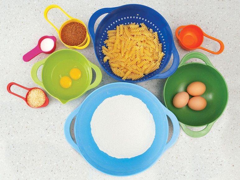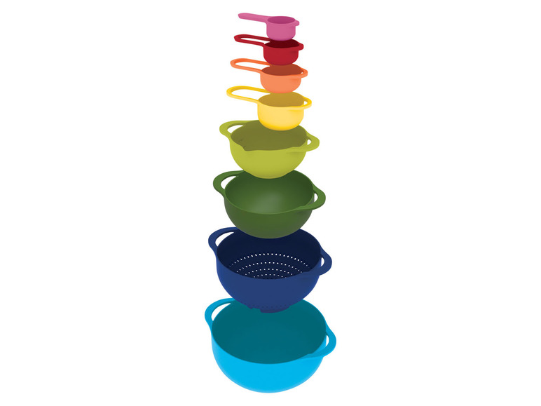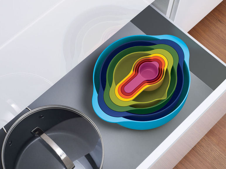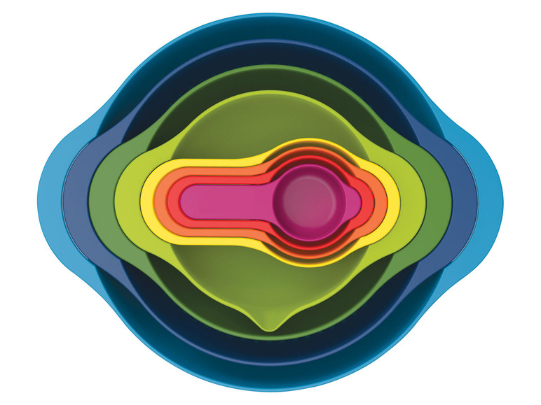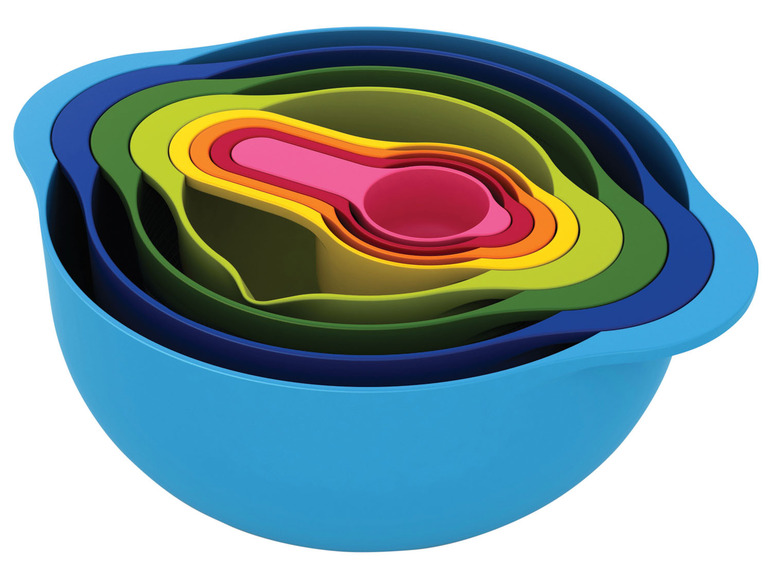 Das innovative Design dieses 8-teiligen Sets ermöglicht ein sauberes Stapeln der einzelnen Elemente bei minimalem Platzbedarf. Die große Rührschüssel hat einen rutschfesten Boden und breite Tragegriffe. Die kleine Rührschüssel enthält Messungen im Inneren für zusätzlichen Komfort und einen Ausgießer für genaues Ausgießen. Messbecher sind so konzipiert, dass sie sicher zusammenschnappen und in Größen von ¼ Tasse (60 ml) bis zu 1 Tasse (250 ml) erhältlich sind. Das Set enthält auch ein großes Sieb.