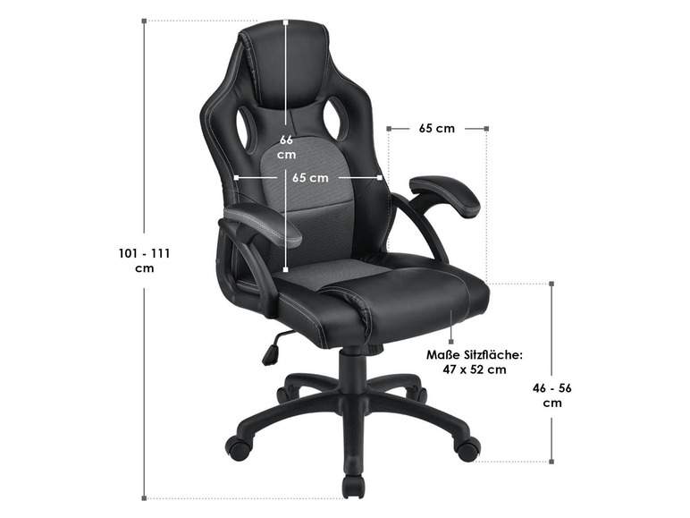 Die Sitzfläche lässt sich mit der Gasdruckfeder stufenlos in der Höhe zwischen 46 und 56 cm verstellen. Dadurch positionierst du den Schreibtischstuhl auf die gewünschte Sitzhöhe. Der Computerstuhl ist um 360° frei drehbar. Dies gewährt größtmögliche Bewegungsfreiheit.