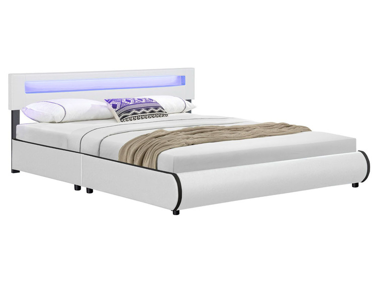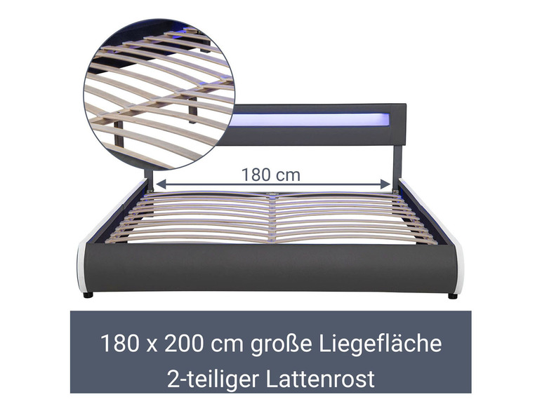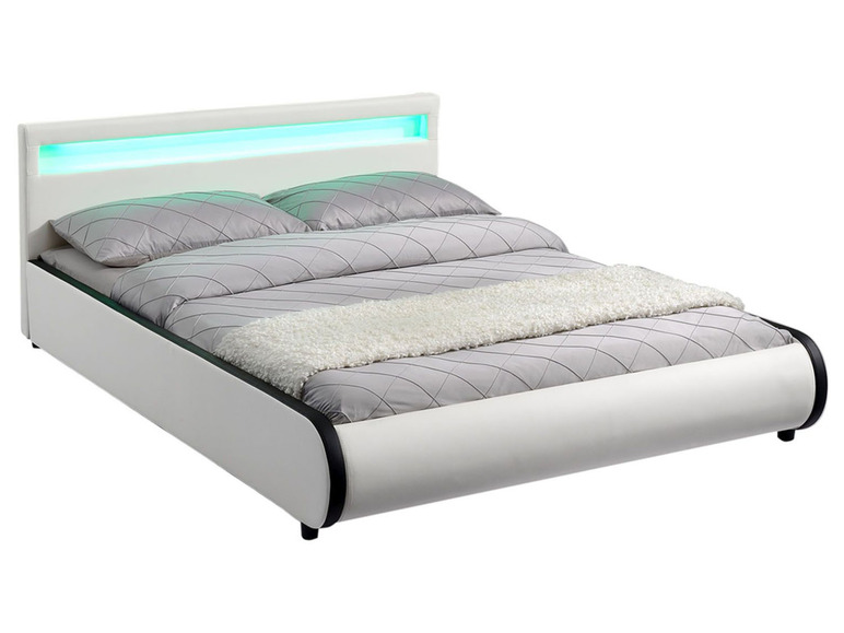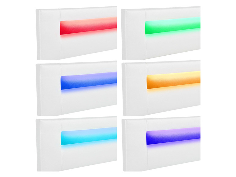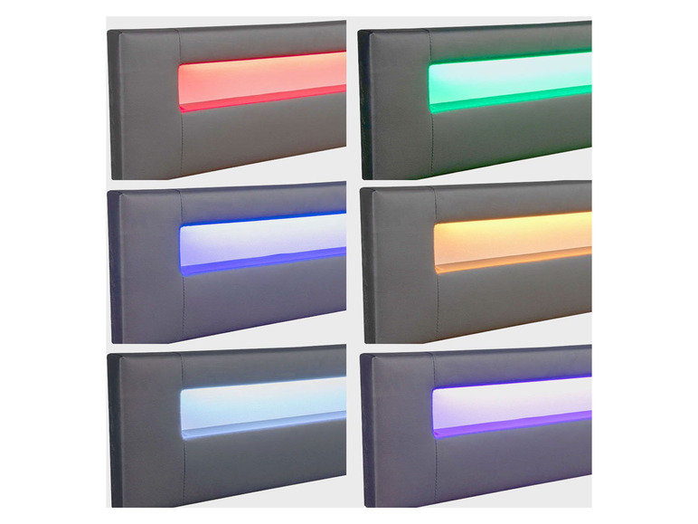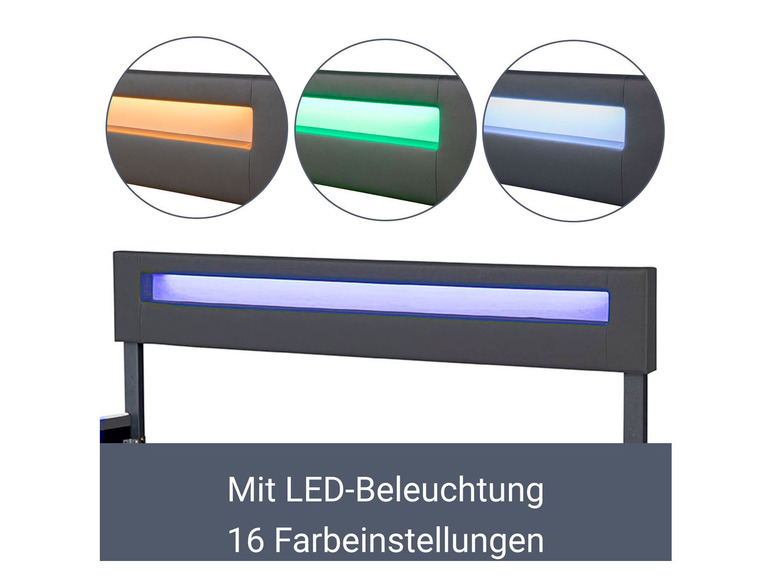 Eine in der Rückenlehne eingelassene LED-Leiste sorgt für eine stimmungsvolle Atmosphäre im Schlafzimmer. Mit der Fernbedienung wählst du zwischen 16 verschiedenen Farbeinstellungen und Helligkeiten aus. Entspanne bei der indirekten Beleuchtung, während du dich an das gemütlich gepolsterte Kopfteil lehnst.