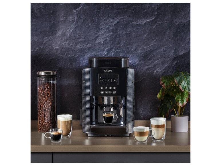 Perfekt für Espresso- und Kaffeeliebhaber: Der platzsparende Arabica Display Kaffeevollautomat besticht durch unkomplizierte Bedienung und sorgt dank langlebiger Brühgruppe aus Metall immer für beste Kaffee-Ergebnisse. Genieße mit dem kompakten Krups Kaffeevollautomaten Arabica eine besonders schnelle und einfache Kaffee-Zubereitung. Dank komfortablem Tasten und Display lassen sich Kaffeespezialitäten von 20 ml bis 180 ml im Handumdrehen dosieren. Das Highlight ist die einzigartige Brühgruppe aus Metall, die es nur von Krups gibt: Metall sorgt für eine lange Lebensdauer und immer heißen Kaffee. Außerdem kommt das Kaffeepulver hier nicht mit Kunststoff in Berührung. Durch das geschlossene Brühsystem erfolgt die Reinigung genauso einfach wie die Kaffeezubereitung: Auf Knopfdruck ohne manuelles Zutun. Ein mühsames manuelles Reinigen der Brühgruppe entfällt.