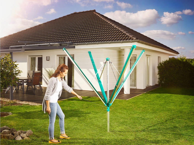 Die Linomatic 500 Deluxe Cover bietet die millionenfach bewährte Leifheit Leinenautomatik und höchsten Bedienkomfort für energieeffiziente und schonende Wäschetrockung an der frischen Luft. Dazu das Easy-Lift-System mit nochmals 20% leichterem Öffnen, automatisches Einziehen der Aufzugsleine und dank des Easy-Close-Comforts komfortables Schließen ohne Bücken durch einfaches Entriegeln am Tragarm. Durch die bewährte Leinenautomatik werden hierbei die Leinen automatisch eingezogen und liegen geschützt in den Tragarmen. Beim nächsten Gebrauch spannen sie sich automatisch wieder auf. Verschmutzte Leinen, die bei herkömmlichen Wäscheschirmen unschöne Streifen auf der Wäsche hinterlassen, gehören der Vergangenheit an. Die zusätzliche Schutzhülle bietet mit ihrem strapazierfähigen und wetterfesten Material zusätzlich einen zuverlässigen Rundum-Schutz des Wäscheschirms. Mit 50 Meter Leinenlänge bietet die Linomatic 500 Deluxe Cover Platz für bis zu fünf Waschmaschinenfüllungen - auch für große Wäschestücke wie Betttücher, Tischdecken und Badehandtücher. Inklusive 8 Haken zur Aufhängung von Kleiderbügeln an den Tragarmen. Alle eingesetzten Materialien sind witterungs- und UV-beständig. Inklusive Schutzhülle und Bodenhülse zum Einbetonieren. Made in Germany.