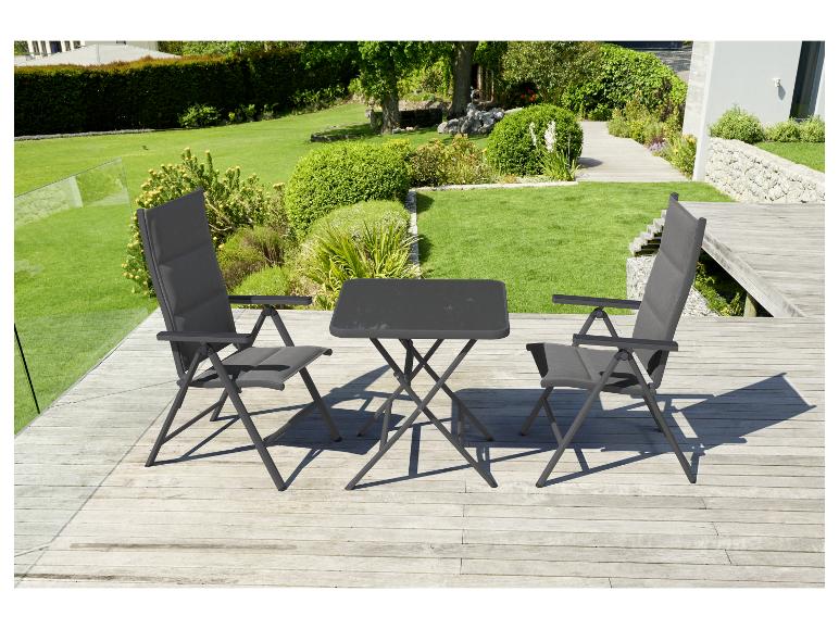| Material: | Gestell: Aluminiumrahmen (100 % pulverbeschichtet), Bezug: Textilene (70 % PVC, 30 % Polyester) |