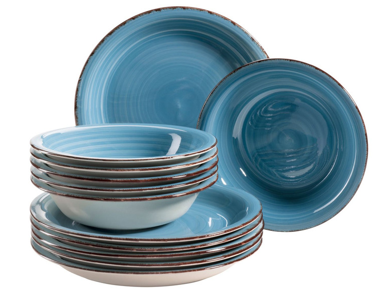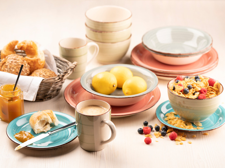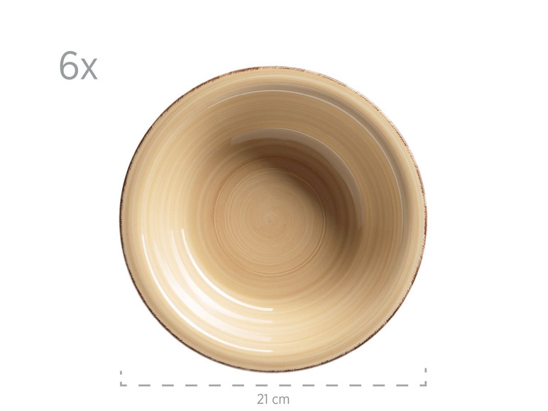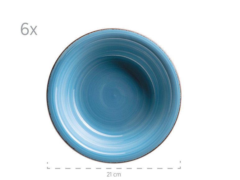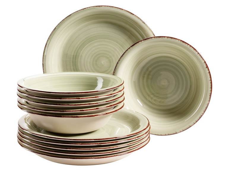 Dieses modern-rustikale Geschirr-Set besteht aus 6 tiefen Suppentellern und 6 flachen Speisetellern in der Farbe Olivgrün. Die bunte Keramik-Geschirr Kollektion LUMACA wird von Hand aus schönem dickwandigen Steingut gefertigt und farbig mit verspielten Linienführungen in Holzoptik handbemalt