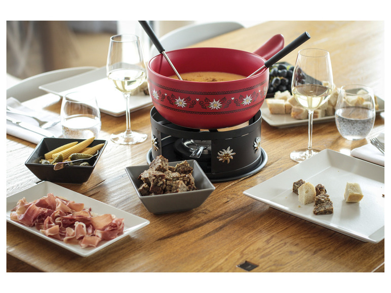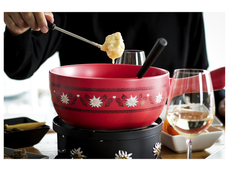 Überrasche deine Liebsten mit einem gemütlichen Schweizer Käsefondue-Abend – nicht nur zur Weihnachtszeit oder zu Silvester! Mit diesem massiven und aufwändig verzierten Käsefondue-Set der Marke MÄSER erlebst du mit Sicherheit einen geselligen Abend beim gemeinsamen Tischkochen. Der Aufbau erfolgt schnell und unkompliziert, das Set steht fest auf dem Esstisch, und keine lästigen Kabel am Tisch stören das Gemeinschaftserlebnis. Das Caquelon aus traditionellem Steingut sowie die Verzierungen auf Glasur und Rechaud bringen das unvergleichliche Hüttengaudi-Gefühl zu nach Hause. Mit Ausnahme des Fonduebrenners reinige bitte alle Teile dieses Sets von Hand mit handelsüblichem Spülmittel. Bitte betreibe den Brenner nur mit Brennpaste – nicht mit Spiritus oder anderen brennbaren Flüssigkeiten. (Wir empfehlen den Einsatz von Brennpaste-Kartuschen des Typs MÄSER 871892.) Für eine objektive Vergleichbarkeit bezieht sich die Füllmengenangabe auf eine randvolle Befüllung. Bitte beachte, dass das Caquelon aus Steingut nicht auf einem Kochfeld erhitzt werden kann.