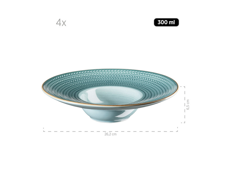 Aufregend exquisit präsentiert sich die ausdrucksstarke Premium-Kollektion "Prospero" der österreichischen Traditionsmarke Mäser. Eine an geschichtsträchtige Lorbeerkränze erinnernde, haptisch fühlbare Reliefstruktur umläuft ein handgepinseltes Spiraldekor, welches jedes Teil zu einem echten Unikat macht. Gefertigt aus robustem und langlebigem Durable Porzellan in dickwandiger, schwerer Qualität erfüllt diese Tafelgeschirr-Serie die besonderen Ansprüche der gehobenen Gastronomie und anspruchsvoller Privatkunden. Die einzigartige Kombination aus fließender Dynamik und selbstbewusster Eleganz wird sanft eingerahmt durch eine händisch aufgemalte, unregelmäßig schimmernde ockerfarbene Umrandung. Die sorgfältig aufeinander abgestimmten Farben dieser Kollektion ermöglichen einen täglich neu erschaffenen Esstisch, der optisch perfekt zu deinen Speisen passt. Selbstverständlich ist die gesamte Serie "Prospero" mikrowellengeeignet und dauerhaft spülmaschinenfest. Dieses Set wird in einer bruchsicheren Transportverpackung versendet. Bitte beachte: Für eine objektive Vergleichbarkeit gehen unsere Füllmengenangaben von einer randvollen Befüllung aus. Aufgrund des hohen handwerklichen Anteils sind kleine Unregelmäßigkeiten und Farbabweichungen in der Glasur möglich.