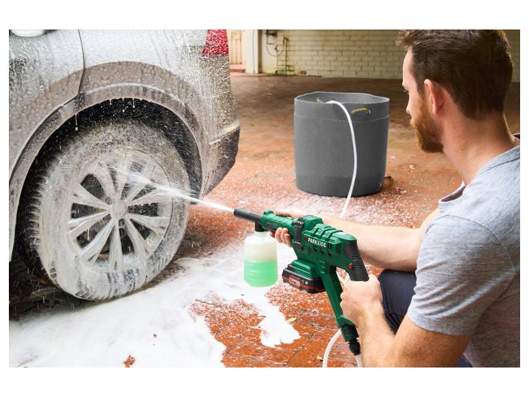 Zubehör | 1x Akku (20 V / 2 Ah) 1x Ladegerät (20 V / 2,4 A) 1x Sprühlanze mit Multifunktionsdüse 1x Düse mit Reinigungsmittelbehälter (ca. 500 ml) 1x ca. 6 m Ansaugschlauch mit Filterkorb 1x Flasche Reinigungsmittel (ca. 500 ml) 1x Tragenetz |