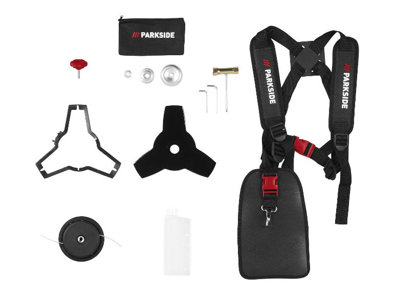 Zubehör: | 1x 3-Zahn-Dickichtmesser 1x Doppelfadenspule mit 2 x 3 m Faden (Ø 2,4 mm) 1x Schultergurt mit Körperschutz und Schnell-Löseeinrichtung 1x Kraftstoff-Mischflasche 1x Zündkerzenschlüssel 2x Innensechskantschlüssel (4 mm und 5 mm) 1x Zubehörtasche |