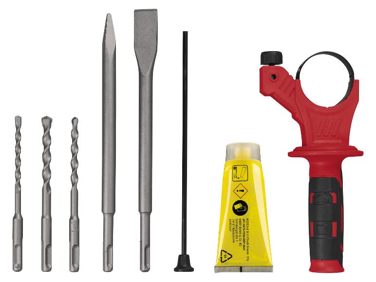 | Zubehör: | 3x SDS-Bohrer, 2x Meißel - 1 x flach / 1 x spitz, 1x Metalltiefenanschlag, 1x Zusatzhandgriff mit Soft Grip, 50 g Sonderfett zur Schmierung der Bohreraufnahme |
