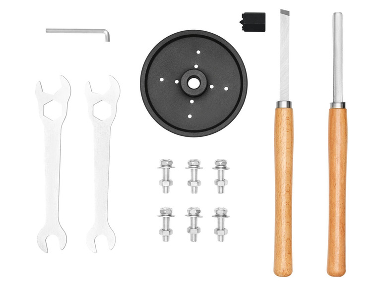 2 Drechselbeitel, 1 Planscheibe, 4-Zack-Körnerspitze, 1 Innensechskantschlüssel, 2 Gabelschlüssel, Befestigungsmaterial zur Werkbankmontage