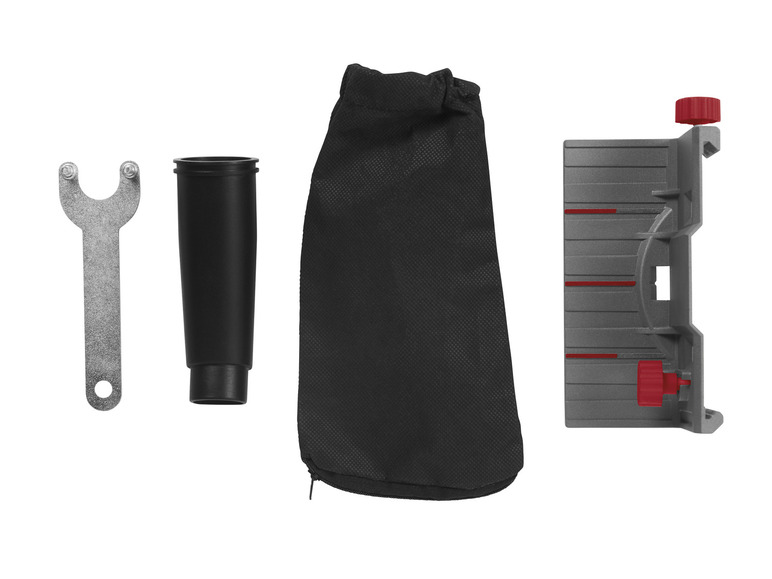 Enthaltenes Zubehör: 1 Frässägeblatt (vormontiert), 1 Zusatzhandgriff, 1 Adapter zur externen Staubabsaugung, 1 Schmutzfangsack, 1 Höhenanschlag, 1 Zweilochschlüssel
