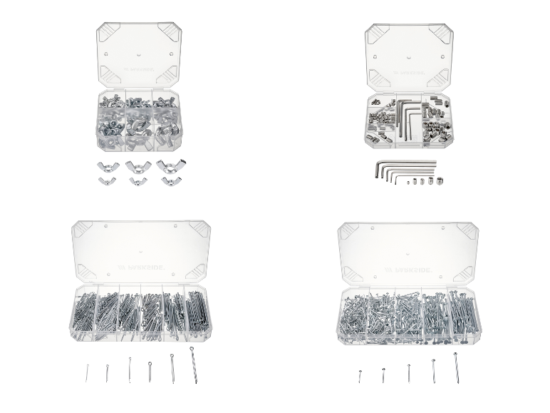 Maße | Flügelmutter-Sortiment: ca. L 114 x B 104 x H 28 mm Madenschrauben-Sortiment: ca. L 114 x B 104 x H 18 mm Splint-Sortiment / Nagel-Sortiment: ca. L 208 x B 114 x H 28 mm |
