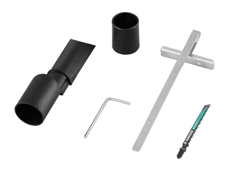 Enthaltenes Zubehör: 1x Holzsägeblatt (Swiss Made), 1x Parallelanschlag, 1x Kunststoff-Gleitschuhaufsatz (vormontiert), 1x Anschluss zur externen Staubabsaugung inkl. Reduzierstück (vormontiert), 1x Spanreißschutz und 1x Spanflugschutz (vormontiert), 1x Innensechskantschlüssel (an Kabeltülle verstaut)