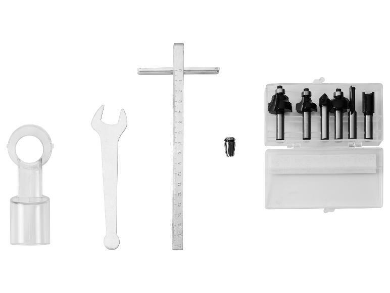 Zubehör: | 6-teiliger Fräsersatz für Holz (1 Profilfräser, 1 Abrundfräser, 1 V-Nutfräser, 2 Nutfräser, 1 Hohlkehlfräser), 1 Parallelanschlag, 1 Spannzange, 1 Maulschlüssel, 1 Adapter zur externen Staubabsaugung |