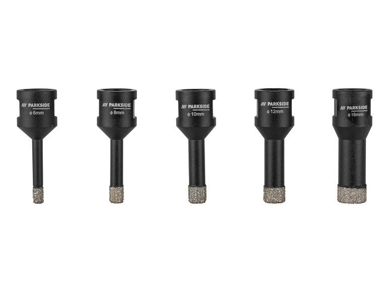 - Diamant-Bohrkronen-Set (5-teilig): ca. Ø 6, 8, 10, 12, 16 mm
