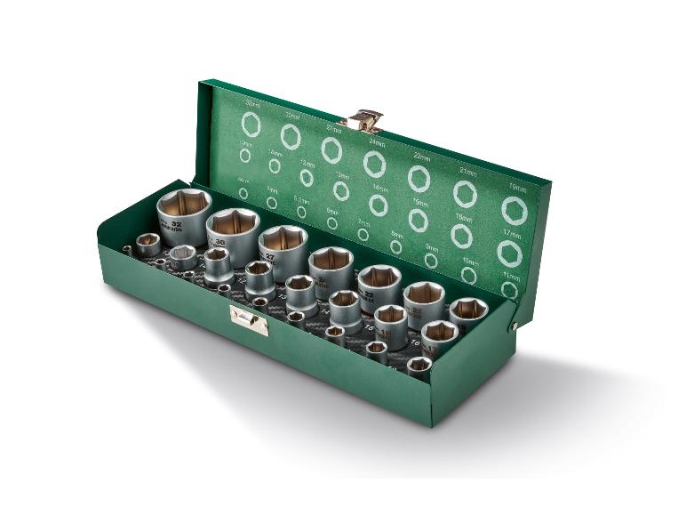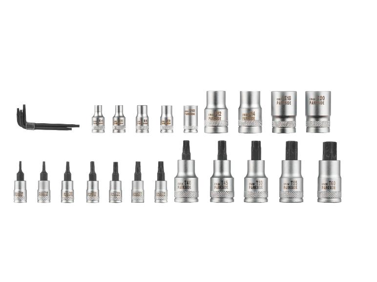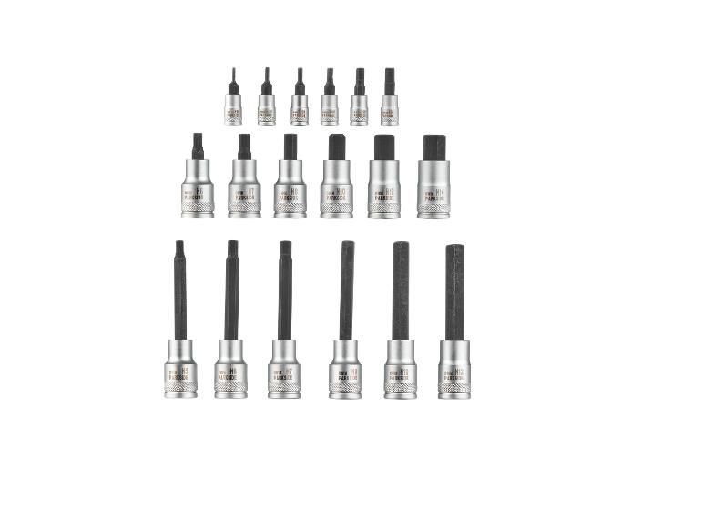 | Inhalt | Steckschlüsselsatz: 11x Steckschlüssel 1/4" (6,3 mm); 13x Steckschlüssel 1/2" (12,5 mm) TX-Bit-Steckschlüsselsatz: 5x TX-Einsätze mit 1/4"-Innenvierkant (6,3 mm); 4x TX-Steckschlüsseleinsätze mit 1/2"-Vierkantantrieb (12,5 mm); 7x TTX-Steckschlüsseleinsätze mit 1/4"-Innenvierkant (6,3 mm); 5x TX-Schraubendreherbits mit 1/2"-Innenvierkant (12,5 mm); 3x TX-Stiftschlüssel abgewinkelt HEX-Bit-Steckschlüsselsatz: 6x HX-Schraubendreherbits mit 1/4"-Innenvierkant (6,3 mm); 6x HX-Schraubendreherbits mit 1/2"-Innenvierkant (12,5 mm); 6x HX-Schraubendreherbits mit 1/2"-Innenvierkant (12,5 mm) |