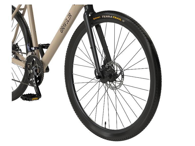 Voll im Trend und auf neuen Pfaden unterwegs mit dem Prophete Graveler 28“. Das Gravelbike verbindet die Eigenschaften eines Trekkingrads mit dem Fahrgefühl eines Rennrads. Der Diamantrahmen mit einer Rahmenhöhe von 55 cm bietet großartige Kraftübertragung dank des Rahmendesigns. So geht beim Antritt fast keine Kraft verloren. Das bedeutet Speed im Gelände und Stock und Stein sind kein Problem. Dafür sorgen unter anderem die Terra Trail Reifen von Continental, die Ihnen unabhängig vom Untergrund Fahrspaß bereiten werden. Das besondere Reifenprofil ist perfekt ausgelegt für eine Mischung aus Stadt- und Geländefahrten, damit kein Untergrund zu uneben ist. Mit der SHIMANO CLARIS Kettenschaltung finden Sie in den 2 x 8 Gängen problemlos Ihren passenden Gang, um zügig von A nach B zu kommen. Die Schaltgruppe ist auf Fitness- und Touringbikes zugeschnitten, bietet aber auch die Möglichkeit Straßenräder im Einsteigerbereich renntauglich zu machen. Immer, wenn hohe Geschwindigkeiten im Spiel sind, spielt Sicherheit eine besonders große Rolle. Daher greifen die mechanischen Scheibenbremsen präzise und kraftvoll und bringen Sie kontrolliert zum Stehen. Die Dual Control Lever von Shimano verbinden die Bedienung von Schaltung und Bremse am komfortablen Prophete Race Bar Gravel-Lenker. Das Graveler von Prophete ist auf einem Alu-Rahmen aufgebaut und hat eine starre Gabel. Das bietet eine gute Steifigkeit für optimale Kraftübertragung. Farblich setzt das Rad auf ein mattes Sandbeige mit schlichtem Schwarz als Kontrast. So steht nicht nur die dynamische Funktion im Vordergrund, sondern auch das legere Racing-Design. Selle Royal Unisex Sattel und Ursus Hinterbauständer vervollständigen das Gesamtpaket.