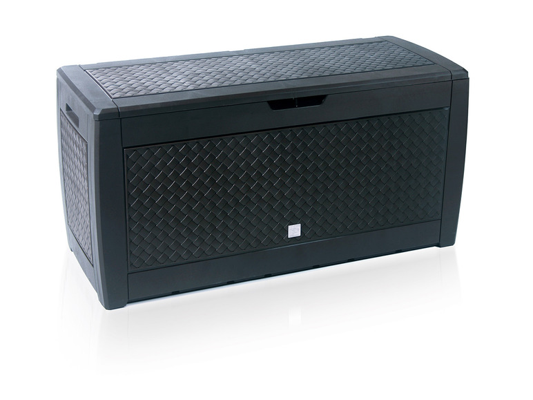 Dekorative Auflagenbox im modernem Flecht- oder Rattan-Design. Sie eignet sich besonders gut für die Aufbewahrung von Sitzauflagen, Kissen, Werkzeugen oder anderen Gartenaccessoires. Durch sein einfaches Klicksystem lässt sich die Gartenbox problemlos montieren bzw. demontieren. Zum einfachen Bewegen sind an der Unterseite vier Rollen und zwei Griffe zum Tragen befestigt.