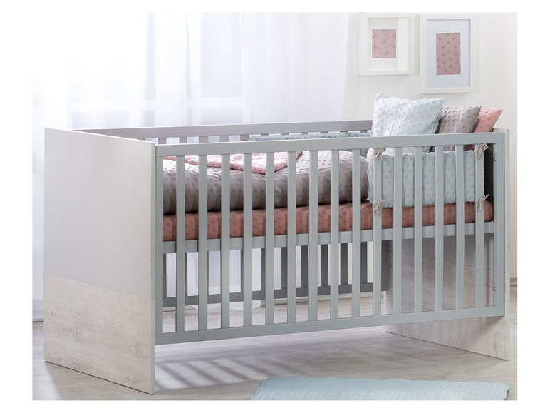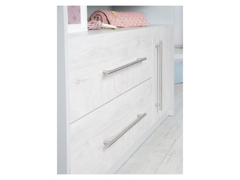Das roba Komplett-Kinderzimmer »Maren 2« überzeugt mit seiner zeitlosen, 2-farbigen Optik im Dekor 'weiß gekalkte Eiche' mit Echtholzhaptik und modernem Lichtgrau. Das Set besteht aus Kombi-Kinderbett, breiter Wickelkommode und 3-türigem Kleiderschrank. Das mitwachsende Kinderbett kann mit separat erhältlichen Umbauseiten zum Juniorbett umgebaut werden und findet bis zum 7. Lebensjahr (bzw. einem Gewicht von 50 kg) Verwendung. Besonders angenehm um Ihr Baby aus dem Bett zu heben ist die obere Position des 3-fach höhenverstellbaren Gitterbetts. Die 3 herausnehmbaren Schlupfsprossen ermöglichen Ihrem Kind den sicheren Ein- und Ausstieg. Das Kinderbett entspricht den aktuellen Sicherheitsstandards nach EN 716 – 1:2017 + AC:2019. Die breite Wickelkommode ohne sichtbare Schrauben mit Wickelansatz und hochwertigen Edelstahl-Relinggriffen und macht mit ihrer angenehmen Wickelhöhe von 90 cm die Babypflege für Eltern und Baby zum Vergnügen. Aufgrund des offenen Fachs, der beiden Schubladen und des Stauraums hinter der Tür ist bei der Babypflege alles schnell griffbereit. Ohne Wickelansatz dient der Wickeltisch als Kommode. Die Wickelkommode entspricht den aktuellen Sicherheitsstandards nach EN 12221 – 1+2:2008 + A1:2013. Der 3-türige Kleiderschrank mit hochwertigen Edelstahl-Relinggriffen bietet viel Stauraum im Kinder- oder Babyzimmer. Die Kleiderstange und die sechs Fachböden sorgen für Ordnung im Kinderkleiderschrank. Aufgrund seiner Höhe von 1,90 m wächst der Schrank bis zum Erwachsenwerden mit. Die Kindermöbelserie »Maren 2« ist in Deutschland entwickelt und ist montagefreundlich.