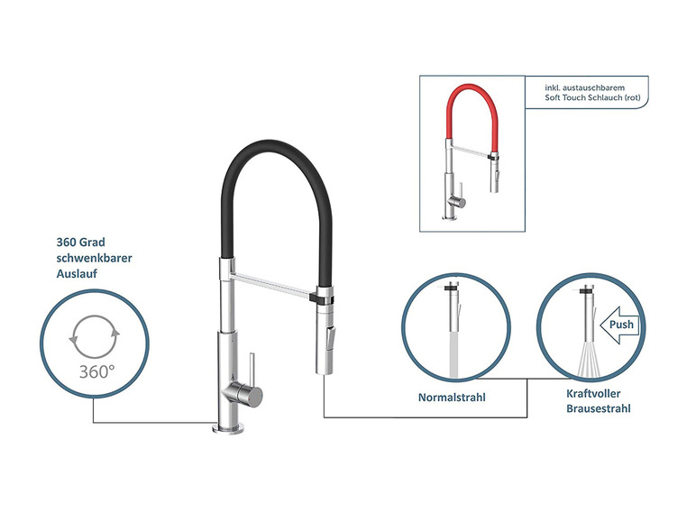 1 x Küchenarmatur STILO mit Geschirrbrause , 2 x flexible Anschlussschläuche 50 cm, Schnellmontageset, Montageanleitung
