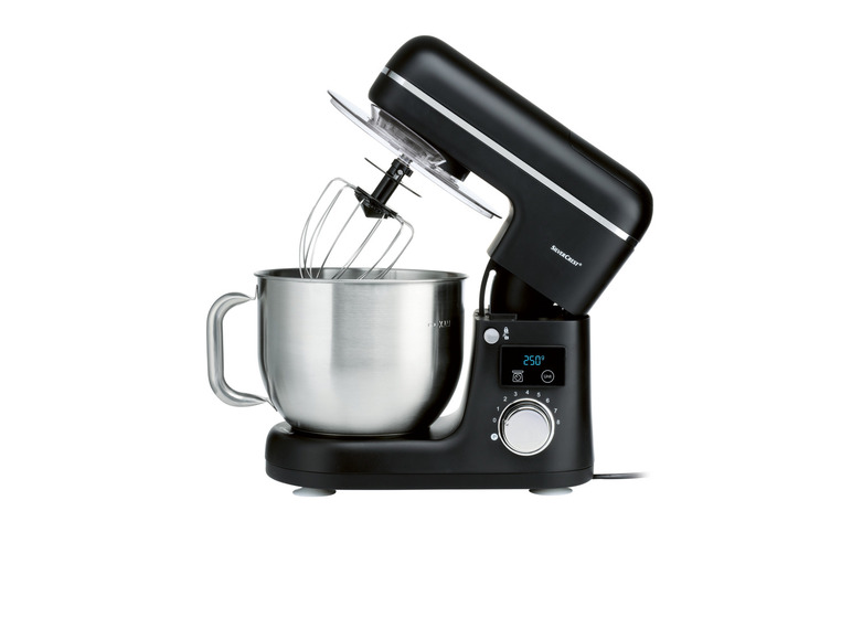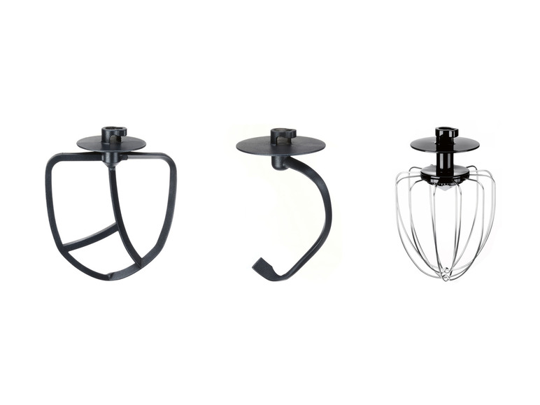 Lieferumfang: | Grundgerät, Rührschüssel, Spritzschutz, Knethaken, Rührbesen, Schneebesen, Mixbehälter, Deckel Mixbehälter, Messbecher Mixbehälter, Bedienungsanleitung mit 10 Rezeptideen |