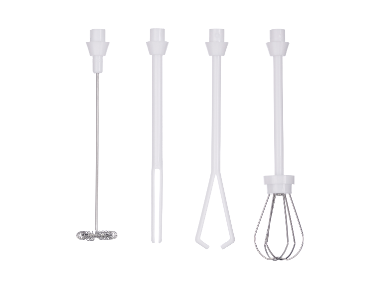 Gewicht: | Gerät: ca. 75 g, Schneebesen: ca. 5,8 g, Aufschäumer: ca. 3,8 g, Mixer: ca. 2,6 g, Rührer: ca. 2,6 g |
