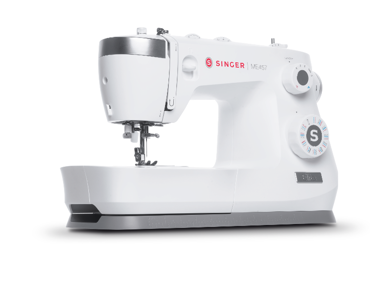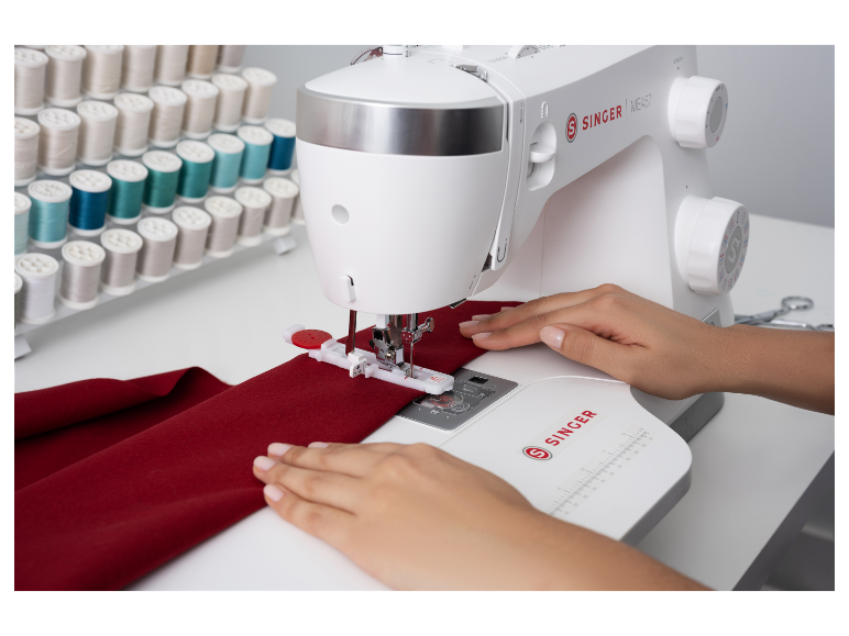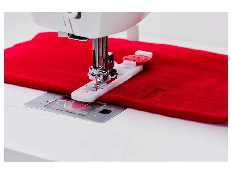 Lieferumfang: | Nadeln, 4 Spulen – verwenden Sie ausschließlich transparente Spulen, die denen aus dem Lieferumfang der Maschine entsprechen (transparente Spulen der Klasse 15 von SINGER®). Eine der Spulen ist bei Lieferung bereits in die Maschine eingesetzt. Filzscheibe – Garnrollenführungsscheibe – Zusätzlicher Garnrollenstift – Pinsel und Nahttrenner – L-Griff-Schraubendreher – Kanten-/Quiltführung Standardnähfuß (T), Blindstichfuß (F), Reißverschlussfuß (I), Einstufiger Knopflochfuß (D), Satinstichfuß (A) |