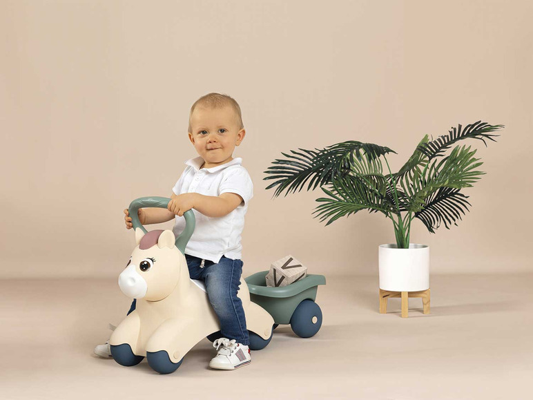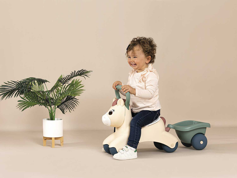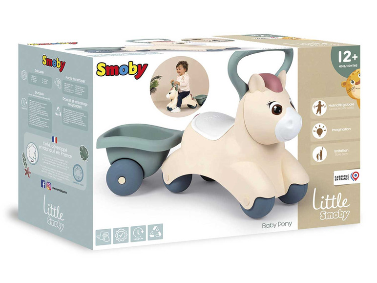 Auf zum ersten selbstständigen Ausritt mit dem niedlichen Little Smoby Baby-Pony Rutscherfahrzeug! Das robuste Rutschfahrzeug kommt in Form eines knuffigen Ponys und wird die Augen kleiner Entdecker zum Strahlen bringen. Dank des ergonomischen Griffes am Kopf des Spielfreunds lässt sich das Rutschauto gut steuern und dient den Eltern gleichzeitig als praktischer Tragegriff. Mit dabei: der kompakte Anhänger, in dem das Lieblingsspielzeug oder Stofftier mit auf Abenteuerfahrt gehen kann. Dank seines geringen Gewichts und den kompakten Maßen ist das Baby-Pony leicht und wendig und wird somit zum idealen Kinderfahrzeug für den Nachwuchs ab 12 Monaten. Hergestellt in Frankreich.