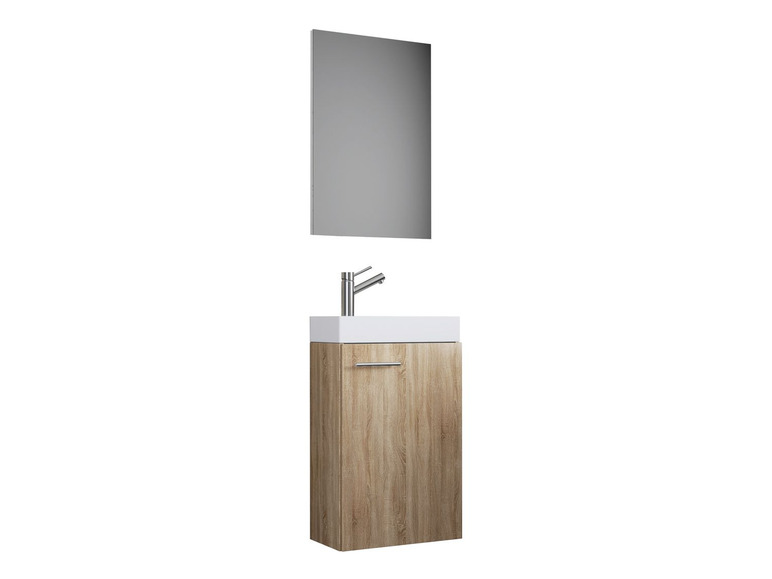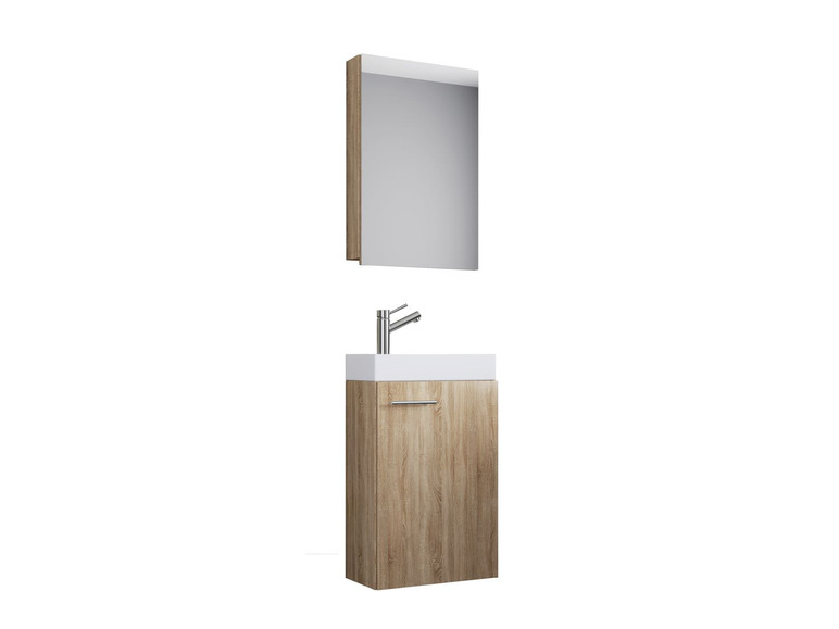 Set besteht aus einem Spiegel oder Spiegelschrank und einem Waschbecken (ohne Armatur) mit Waschbeckenunterschrank in Weiß, Sonoma-Eiche oder Schwarz