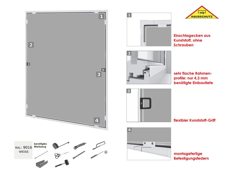 Das Großartige an diesem Insektenschutzrahmen ist die flache Einbautiefe von nur 4,3 mm. Dies ermöglicht eine Anbringung auch bei eng anliegenden Rollläden. Im Bausatz enthalten sind pulverbeschichtete Aluminium-Profile, ein reißfestes Fiberglasgewebe, Einschlagecken aus Kunststoff und die montagefertigen Befestigungsfedern. Mit diesem Insektenschutz werden Sie für viele Jahre Freude haben.