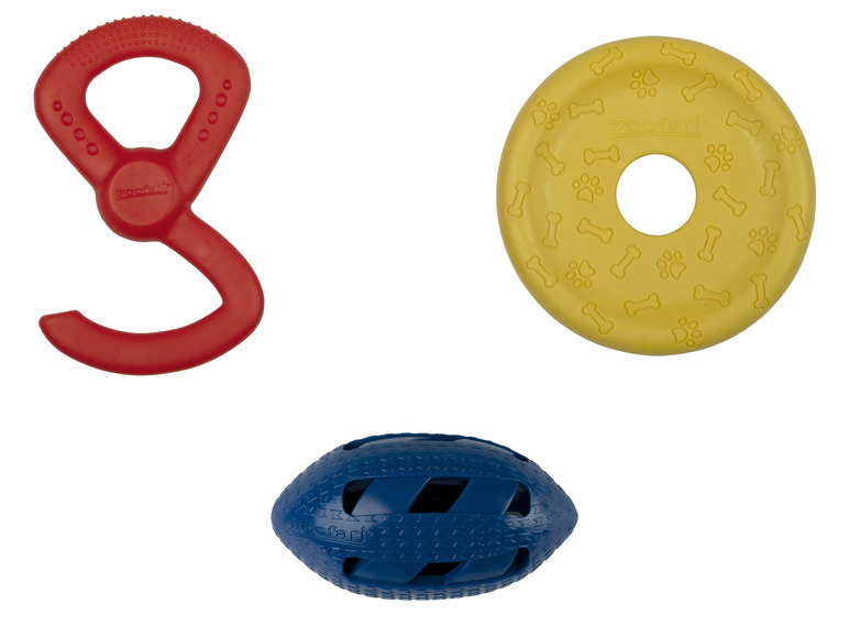 Maße: | Hundespielzeug: ca. L 22 x B 14 x H 3 cm Hundespielzeug Rugby: ca. L 14 x B 8 x H 8 cm Hundespielzeug Frisbee: ca. Ø 20 x H 2,5 cm |
